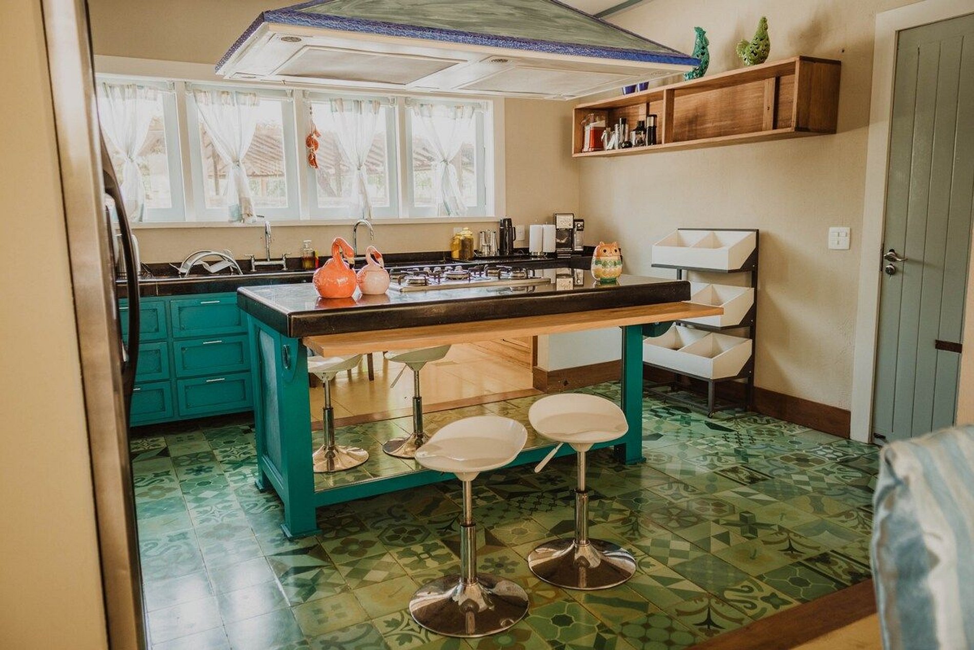 A parte interna é toda em piso frio e conta com ambiente totalmente integrado, com salas de estar com Smart TV, jantar, bar, mesa de jogos e uma cozinha completa, com fogão de cinco bocas, forno, geladeira, freezer, , micro-ondas, espremedor de suco, cafeteira Dolce Gusto, airfryer ,e liquidificador. .