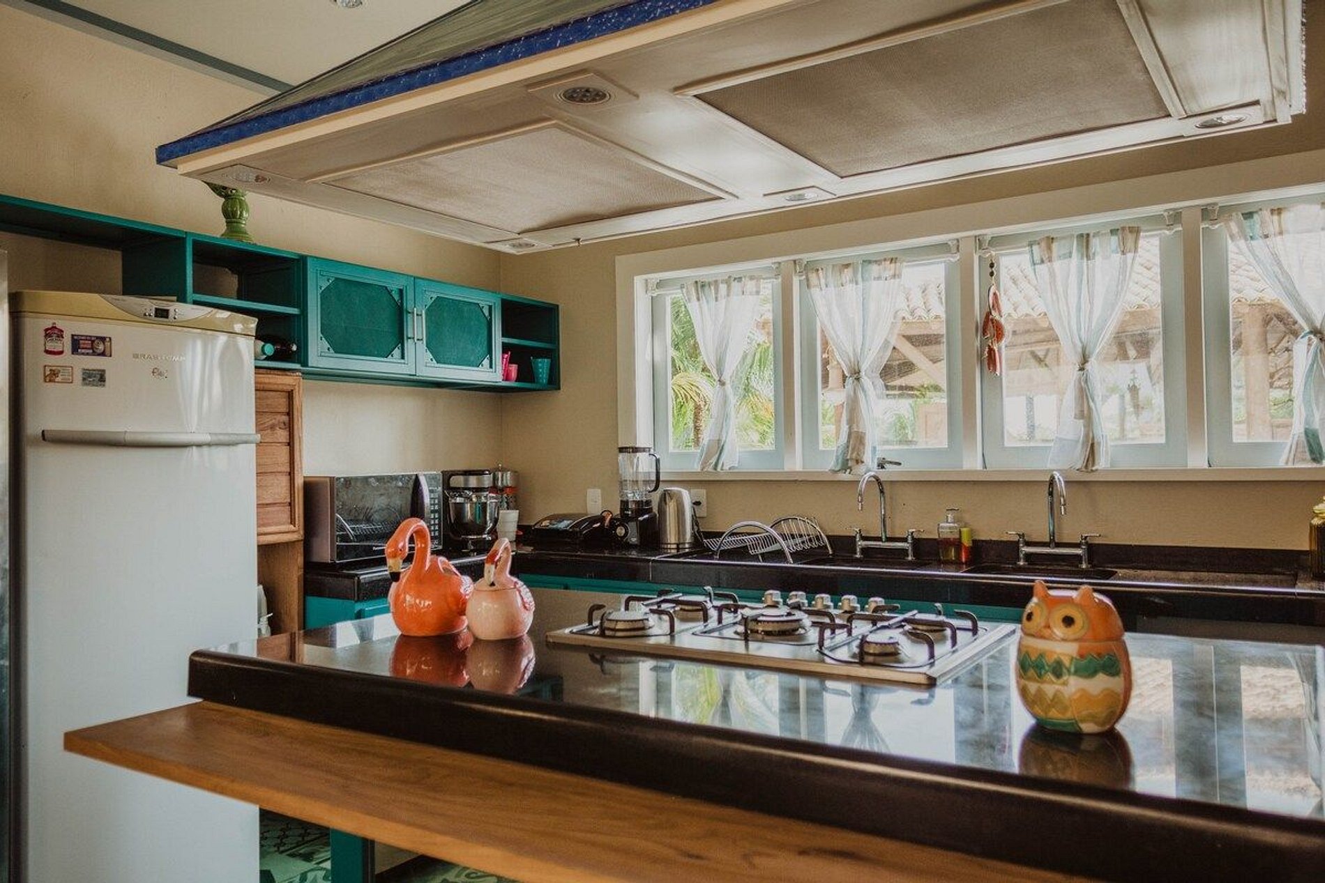 A parte interna é toda em piso frio e conta com ambiente totalmente integrado, com salas de estar com Smart TV, jantar, bar, mesa de jogos e uma cozinha completa, com fogão de cinco bocas, forno, geladeira, freezer, , micro-ondas, espremedor de suco, cafeteira Dolce Gusto, airfryer ,e liquidificador. .